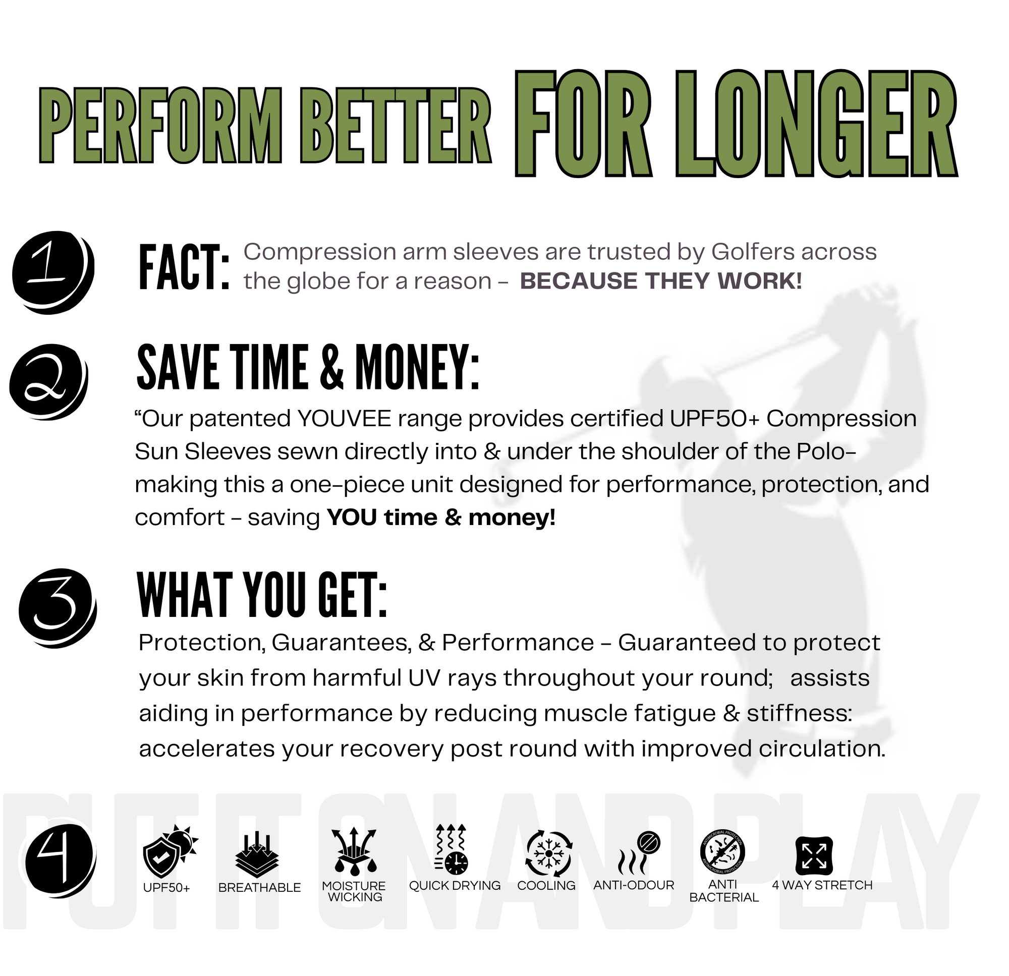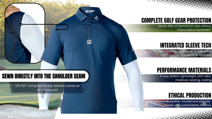 YOUVEE® golf shirts feature built-in UPF 50+ compression sun sleeves that block 98% of harmful UV rays without chemicals or sunscreen.