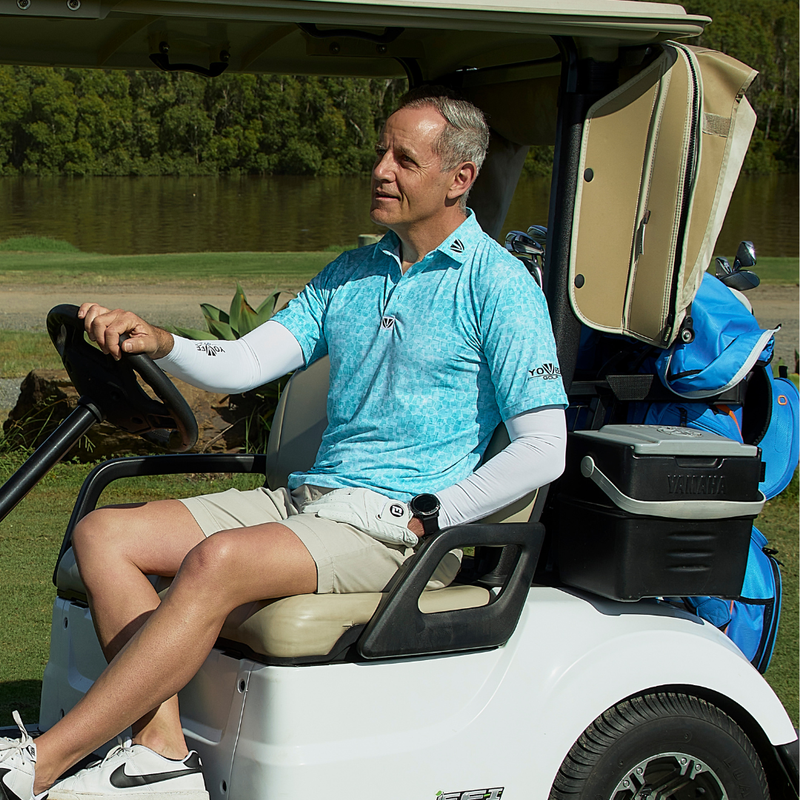 A one-piece Polo that protects without extra steps. One that doesn't require extra gear in your bag, and the extra cost. One that you don't even need to think about!. By stitching certified UPF 50+ compression sleeves directly into our very own designer, lightweight, high-performance polos, we eliminated the hassle and added real benefits. It looks like you're wearing separate sleeves but you are not - the beauty is you just have to Put it on & Play!- Simple!. These sleeves don’t just block UV — they support recovery, reduce fatigue, keep you cool and keep you fresher for longer. We teamed up with trusted partners to build it — and we’re just getting started.